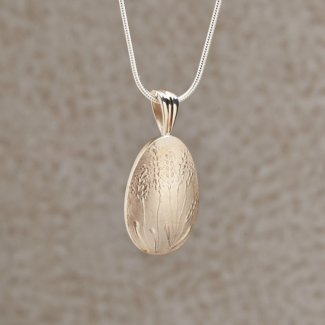 Lavender Bud Locket Keepsake Pendant. Artist-designed hand-crafted in textured sterling silver features a secure watch back closure to hold a small portion of cremation ashes hair or dried flowers. Closure requires no glue or tools. 1/ea.