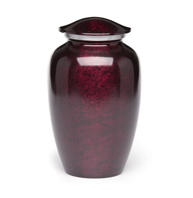 Classic alloy cremation urn with beautiful rich burgundy red wine color.