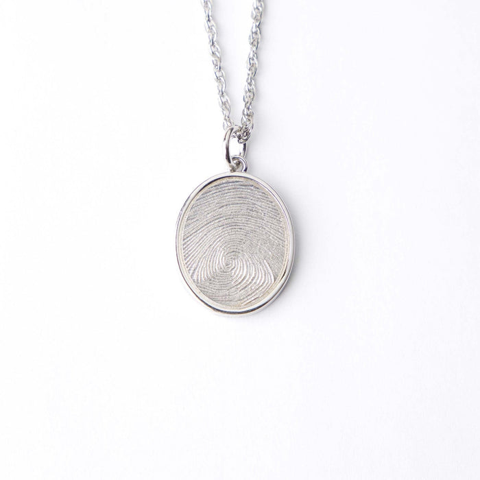 My Living Touch™ Oval Fingerprint Pendant is made from sterling silver and is handcrafted with care by our artisan jewelers. This classic oval shaped pendant includes a rimmed border, which artfully displays a fingerprint. Exclusively designed, and hand polished the Oval Pendant is a unique keepsake that lasts.