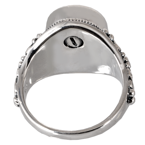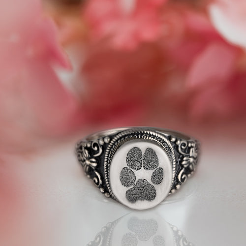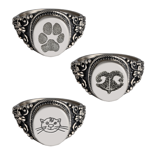 The antique style ring with intricate side flourishes can be engraved with a pet's actual paw or nose print and has a screw back enclosure so you can store ashes, soil or sand from a favorite beach. The cremation ring can be permanently sealed using superglue (not included). The inside can be engraved (behind the face) for an additional cost.